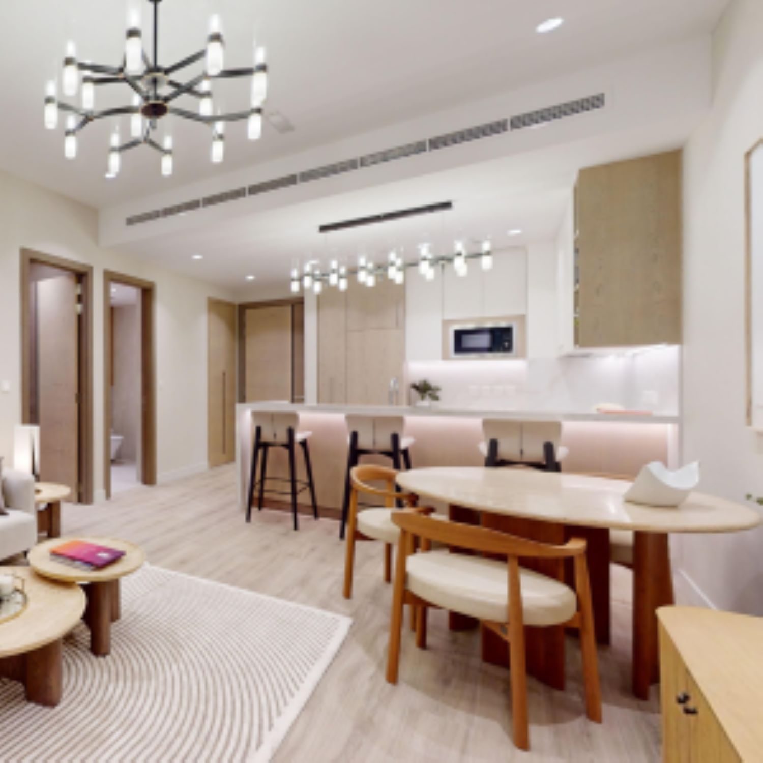 Each apartment features European interior design with natural materials and tranquil color palettes, creating a serene ambiance that combines comfort and style seamlessly.
